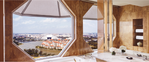 ザ・リッツ・カールトン・ミレニア・シンガポールの代名詞となっているのが、バスルームに設置された大きな「八角形の窓」です。「世界一セクシーなバスルーム」と称賛されるこの場所で、夜景を眺めながらバスタブに浸かるひとときは、まさに非日常の極み。広々とした客室(全室51㎡以上)は、ベッドに横たわった状態でも外の景色が最適に見えるよう計算し尽くされています。