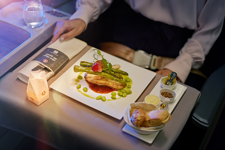 世界三大料理といわれるトルコ料理を中心に、バラエティに富んだ機内食を提供するターキッシュ エアラインズ。航空会社格付け機関より世界一のビジネスクラス機内食に選出されるなど、豊富な受賞歴を誇り、そのクオリティの高さでも知られています。特にビジネスクラスには「フライングシェフ」と呼ばれる専任スタッフが乗務し、機内食の最後の仕上げや盛り付けを行い前菜からグリル料理、デザートと本格的なコース形式でサーブしてくれます。