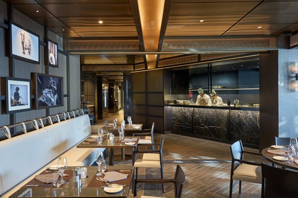 厳選された仕入先と新鮮な食材を活かした最上級の食へのこだわりも大きな特徴。ルームサービスも含めて10か所の豊富な選択肢があり、2箇所の自由席性ダイニングの他、寿司バーも備えるアジア料理の「サクラ」を含むスペシャリティダイニング、バッフェを含めたお食事とドリンクは原則無料。船内唯一の有料レストランでは、ナイトの称号を授与された総料理長考案のコース料理でお客様をもてなします。