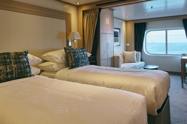 お部屋の広さ:87㎡/2室 バトラーサービス付き 船首に面した大きな窓が特徴のプレミアムな客室。随一の客室面積を誇ります。