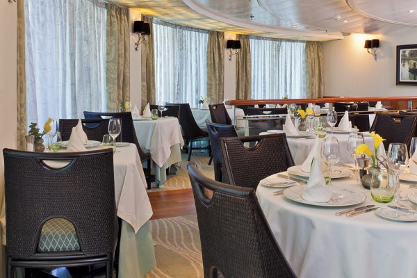 客船がいかにラグジュアリーかを示す目安のひとつに、船内空間のゆとりがあげられます。セブンシーズ ナビゲーターは乗客一人あたりの空間保有面積が非常に大きく、船内では静かでゆったりとした時間をお過ごしいただけます。また、クルー1人に対して乗客1.56人という高い乗務比率により、細やかで行き届いたサービスを実現しています。ダイニングで列に並ぶ、クルーがなかなか来ないといった心配もありません。