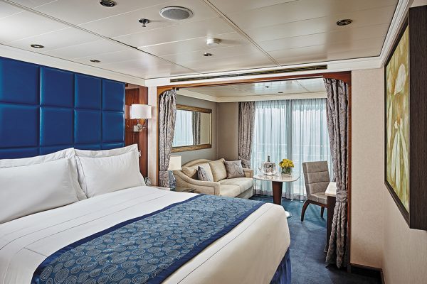 スイートの広さは81㎡。リビングルーム+海が見渡せる大きなバスルームがあるベッドルーム。最大定員4名。パーソナルバトラー付き。シニアオフィサーとのお食事やキャビン内でのカクテルパーティなどの様々な特典がついてます。