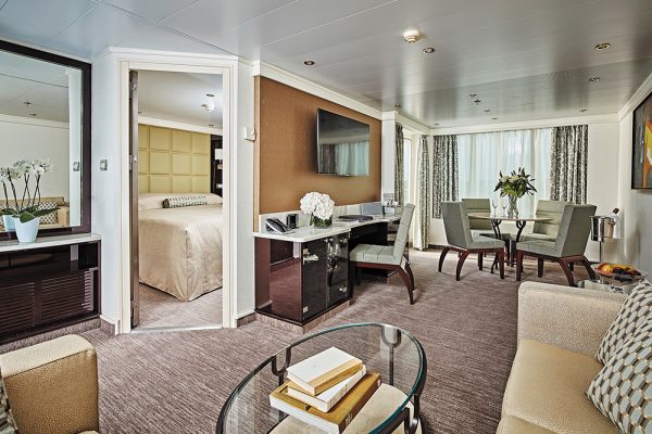 この素晴らしいスイートはまさにSeven Seas Navigator®船上のパークアベニューです。エレガントなローズウッド製の家具や贅沢なファブリック類、クリスタル製のシャンデリアを配した上品で快適な空間で、パーソナルバトラーがいかなるご要望にもお応えいたします。ベッドルーム1室にバスルーム2室と化粧室、広いリビングルームにプライベートバルコニー2つを備えた一流のスイートは、新しいご友人の贅沢なおもてなしに最適です。